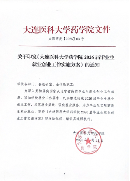 学院高度重视就业工作,结合毕业生规模与专业特点,制定了《大连医科大学药学院2026届毕业生就业创业工作实施方案》,明确分工、压实责任,构建“院领导—教研室主任—导师—骨干党员—辅导员”五级联动责任体系,建立全员参与、动态监测、考核激励三项工作机制,深入推进访企拓岗促就业专项行动,持续开展考研复试指导、专场招聘会等系列活动,实行“一生一策”动态台账管理与周调度、月通报制度,将就业成效与评优评先、招生名额分配挂钩,确保圆满完成2026届毕业生就业创业工作目标任务。